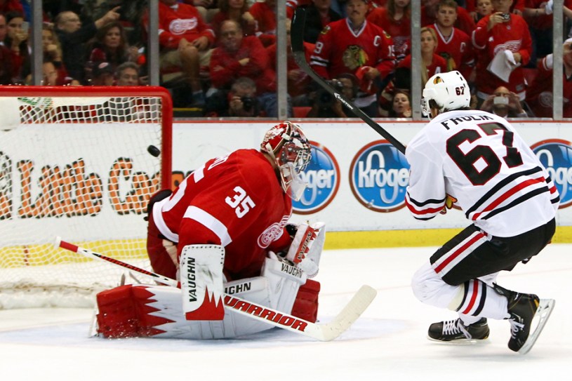 In the 2013 Western Conference Semifinals, the Presidents’ Trophy winning Blackhawks trailed the Detroit Red Wings 3-1 in the series. After a 4-1 win at the United Center in Game 5, the Blackhawks looked to send the series to a seventh game with a win in Detroit, something they had not done earlier in the series. In Game 6 the Hawks trailed 2-1 going into the third period with their season on the line. An early goal by Handzus tied the game 2-2, and a goal by Bickell soon after suddenly gave the Hawks a 3-2 lead over Detroit. With the Wings pressing, Michael Frolik blocked a shot and went off on a breakaway where he was slashed and given a penalty shot and a chance to make it a two goal game…